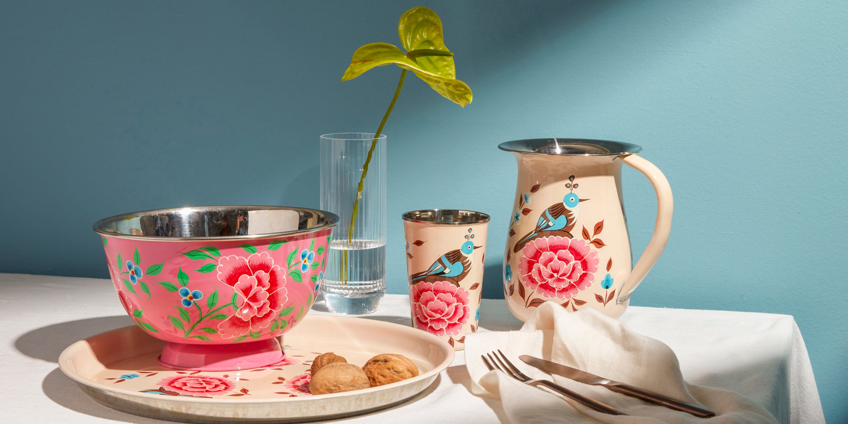Mavi kafalı kuş ve büyük pembe çiçek motifi ile süslenmiş el boyaması sürahi.